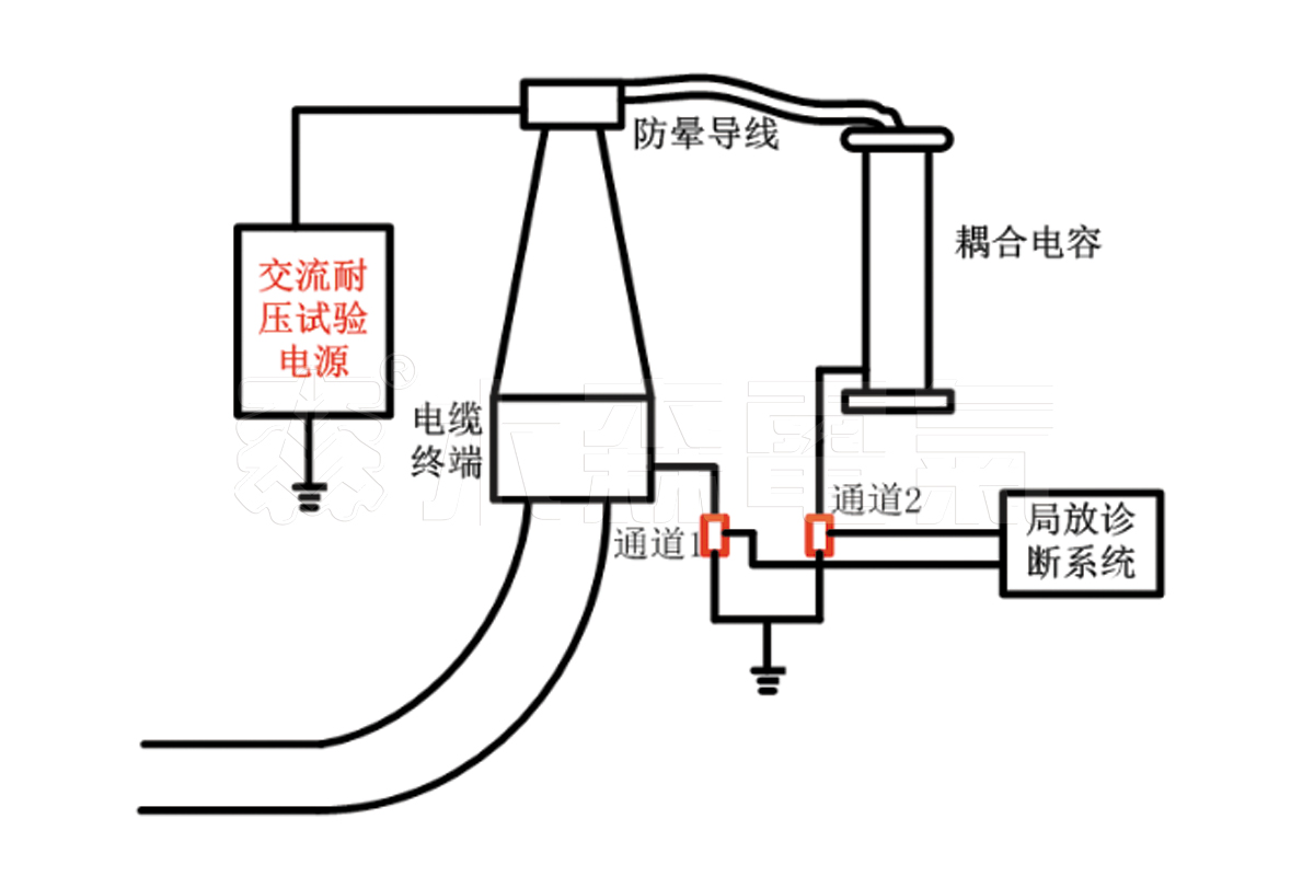 電纜終端局放測試回路:電纜終端的局放測試回路如下圖,當被試電纜內部發生了局部放電時,耦合電容瞬時對電纜終端充電,形成高頻的脈沖充電電流波形,脈沖電流的幅值、發生的頻度反映了電纜內部局部放電的嚴重程度,通道1、通道2兩個傳感器將局放信號傳送至局放診斷系統進行分析處理。